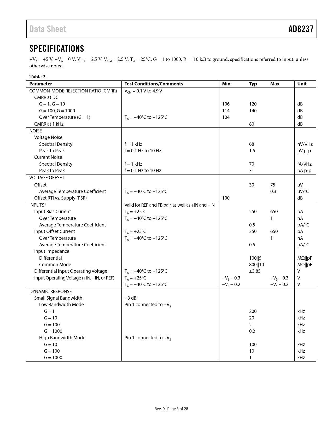 Data Sheet AD8237 SPECIFICATIONS Table 2 Parameter Test Conditions/Comments Min Typ Max Unit