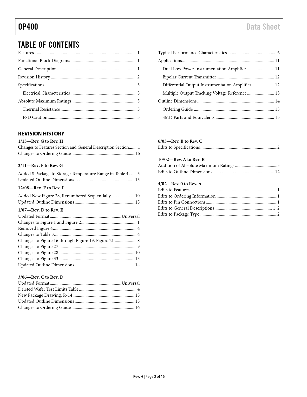link to page 1 link to page 1 link to page 1 link to page 2 link to page 3 link to page 3 link to page 5 link to page 5 link to page 5 link to page 6 link to page 11 link to page 11 link to page 12 link to page 12 link to page 13 link to page 14 link to page 15 link to page 15 OP400Data SheetTABLE OF CONTENTS Features .. 1 Typical Performance Characteristics ..6 Functional Block Diagrams ... 1 Applications ... 11 General Description ... 1 Dual Low Power Instrumentation Amplifier ... 11 Revision History ... 2 Bipolar Current Transmitter ... 12 Specifications ... 3 Differential Output Instrumentation Amplifier .. 12 Electrical Characteristics ... 3 Multiple Output Tracking Voltage Reference ... 13 Absolute Maximum Ratings .. 5 Outline Dimensions ... 14 Thermal Resistance .. 5 Ordering Guide .. 15 ESD Caution .. 5 SMD Parts and Equivalents .. 15 REVISION HISTORY 1/13—Rev. G to Rev. H6/03—Rev. B to Rev. C Changes to Features Section and General Description Section .. 1 Edits to Specifications ... 2 Changes to Ordering Guide ... 15 10/02—Rev. A to Rev. B2/11—Rev. F to Rev. G Addition of Absolute Maximum Ratings ... 5 Added S Package to Storage Temperature Range in Table 4 ... 5 Edits to Outline Dimensions... 12 Updated Outline Dimensions ... 15 4/02—Rev. 0 to Rev. A12/08—Rev. E to Rev. F Edits to Features... 1 Added New Figure 28, Renumbered Sequential y ... 10 Edits to Ordering Information .. 1 Updated Outline Dimensions ... 15 Edits to Pin Connections .. 1 1/07—Rev. D to Rev. E Edits to General Descriptions ... 1, 2 Updated Format .. Universal Edits to Package Type ... 2 Changes to Figure 1 and Figure 2 ... 1 Removed Figure 4 ... 4 Changes to Table 3 .. 4 Changes to Figure 16 through Figure 19, Figure 21 .. 8 Changes to Figure 27 .. 9 Changes to Figure 28 .. 10 Changes to Figure 33 .. 13 Updated Outline Dimensions ... 14 3/06—Rev. C to Rev. D Updated Format .. Universal Deleted Wafer Test Limits Table ... 4 New Package Drawing: R-14 ... 15 Updated Outline Dimensions ... 15 Changes to Ordering Guide .. 16 Rev. H | Page 2 of 16 Document Outline Features General Description Revision History Specifications Electrical Characteristics Absolute Maximum Ratings Thermal Resistance ESD Caution Typical Performance Characteristics Applications Dual Low Power Instrumentation Amplifier Bipolar Current Transmitter Differential Output Instrumentation Amplifier Multiple Output Tracking Voltage Reference Outline Dimensions Ordering Guide SMD Parts and Equivalents