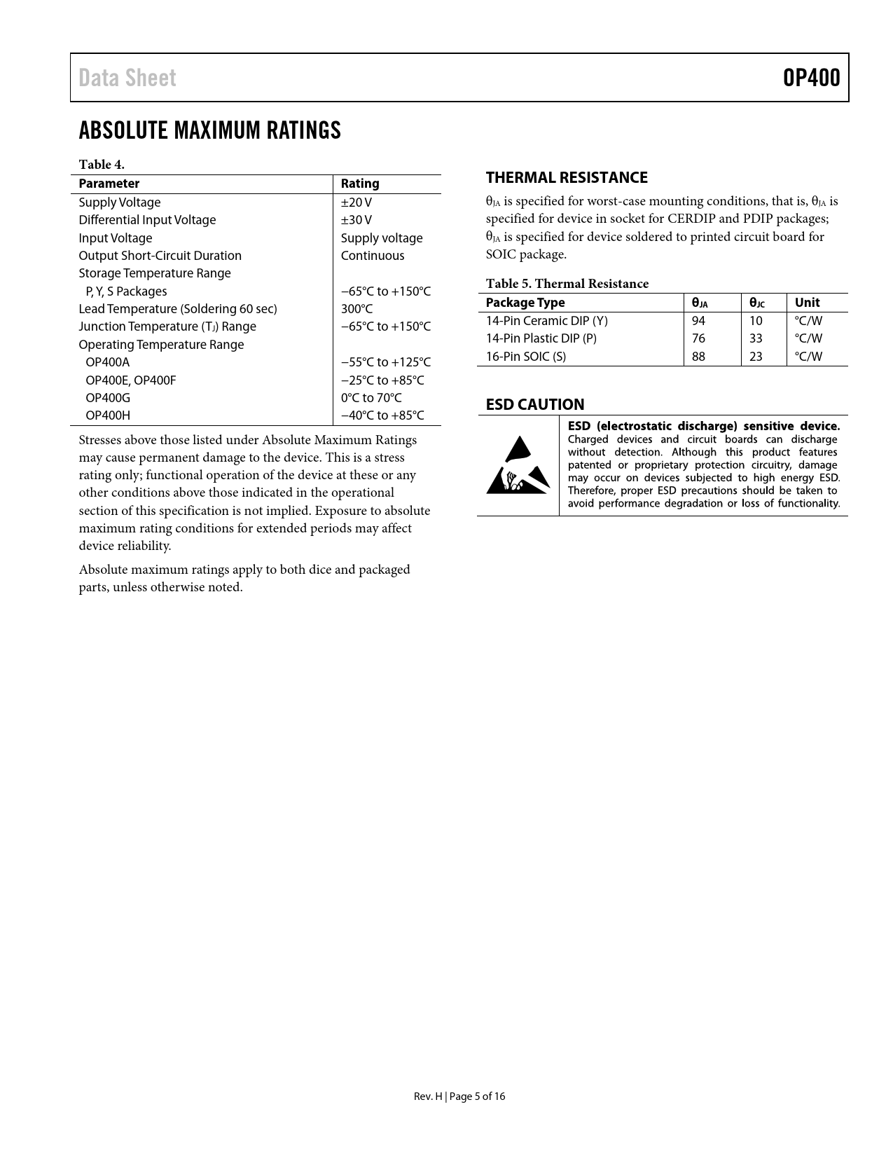Data Sheet. OP400. ABSOLUTE MAXIMUM RATINGS. Table 4. Parameter. Rating. THERMAL RESISTANCE. Table 5. Thermal Resistance
