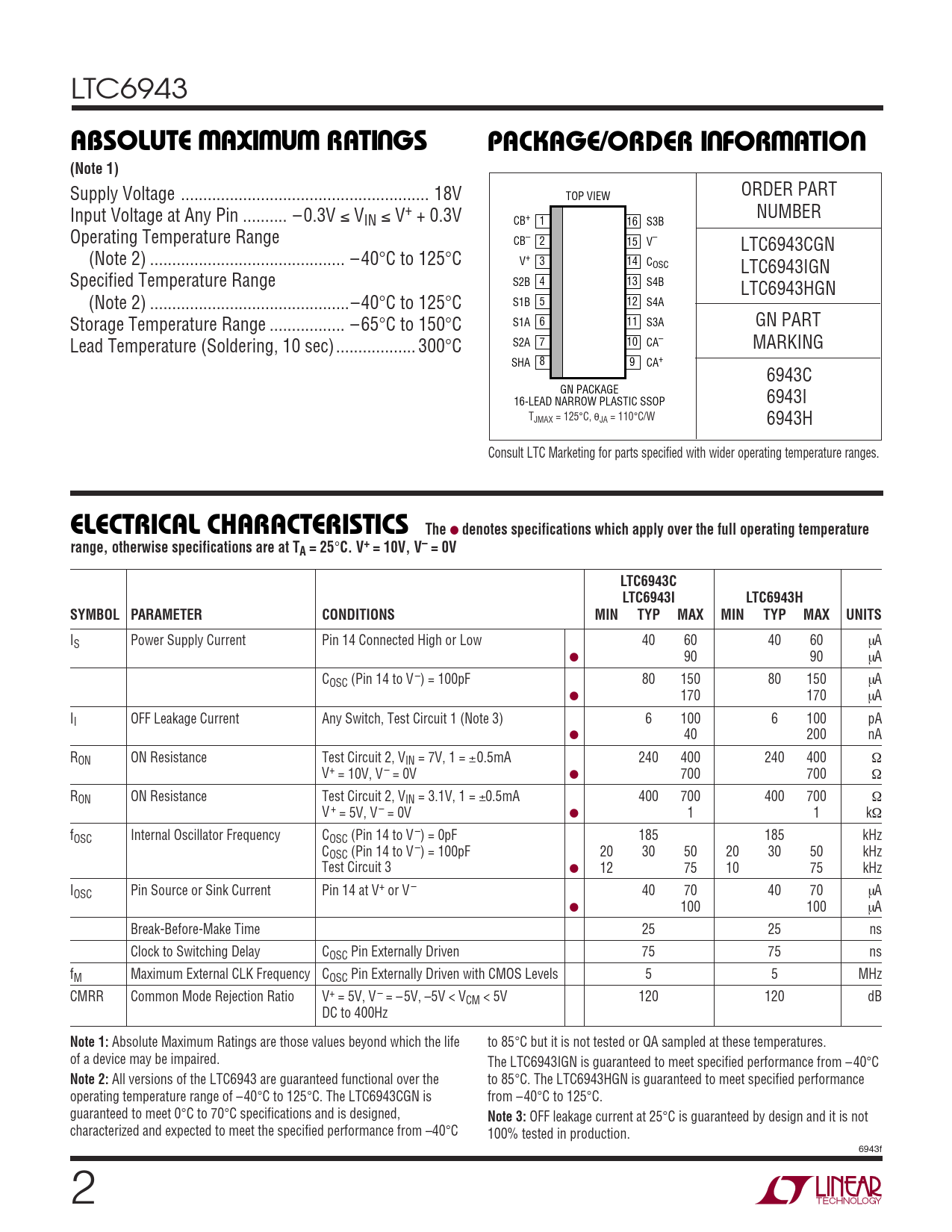 C. V+ = 10V, V– = 0V LTC6943C LTC6943I LTC6943H SYMBOL PARAMETER CONDITIONS MIN TYP MAX MIN TYP MAX UNITS