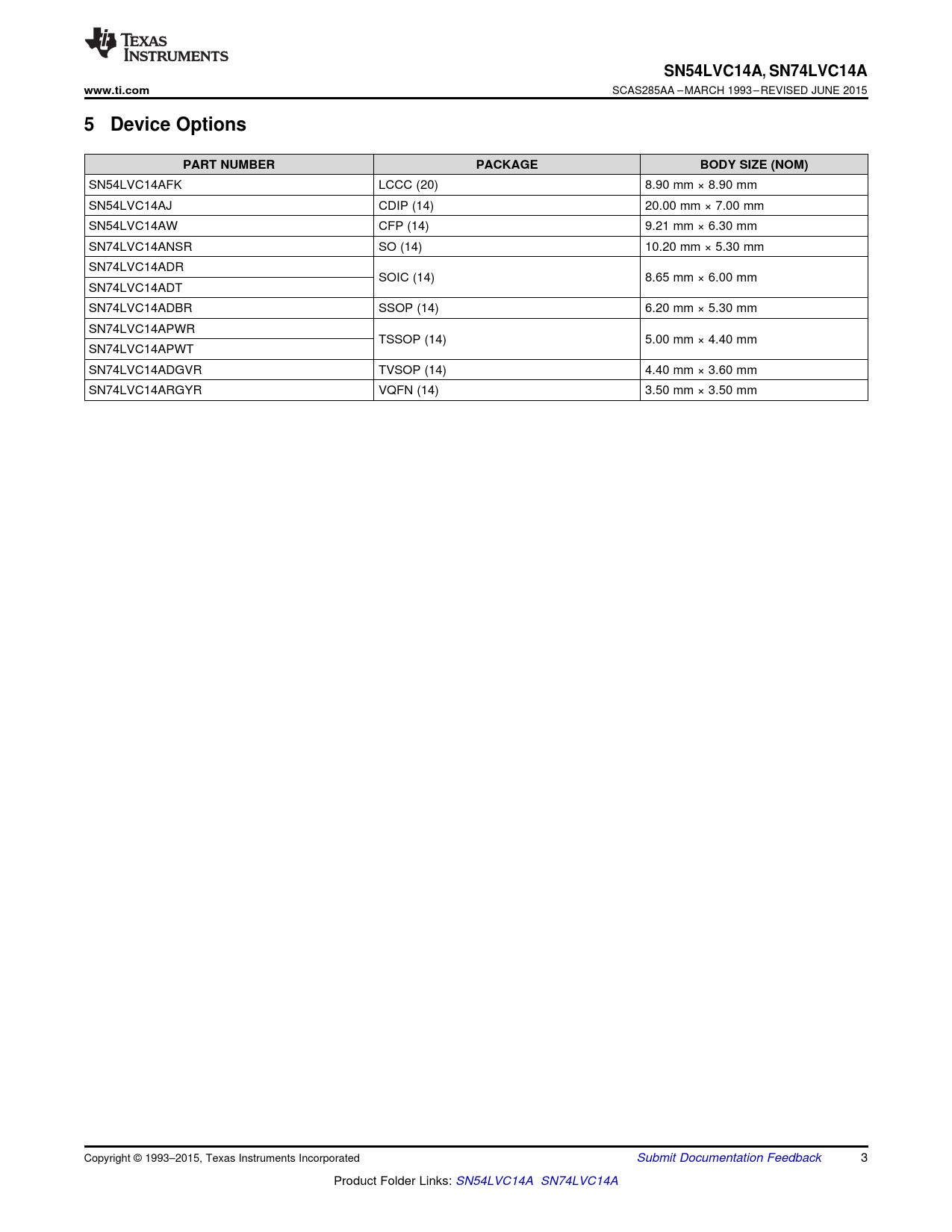 | Seiten / Seite | 37 / 3 — SN54LVC14A. , SN74LVC14A. www.ti.com. 5 Device Options. PART NUMBER. … |