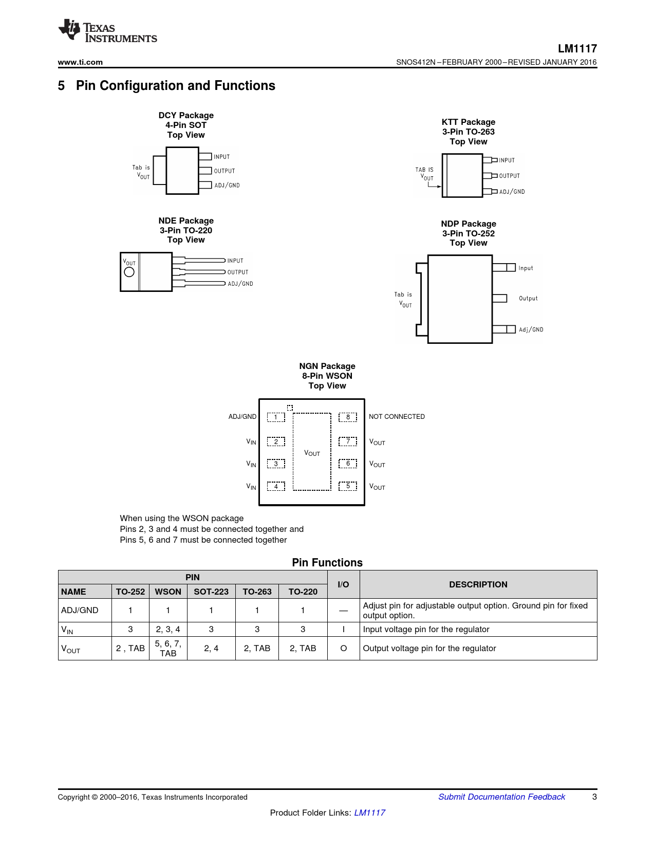 5 Pin Configuration and Functions DCY Package KTT Package 4-Pin SOT 3-Pin TO-263 Top View Top View NDE Package NDP Package 3-Pin TO-220 3-Pin TO-252 Top View Top View NGN Package 8-Pin WSON Top View