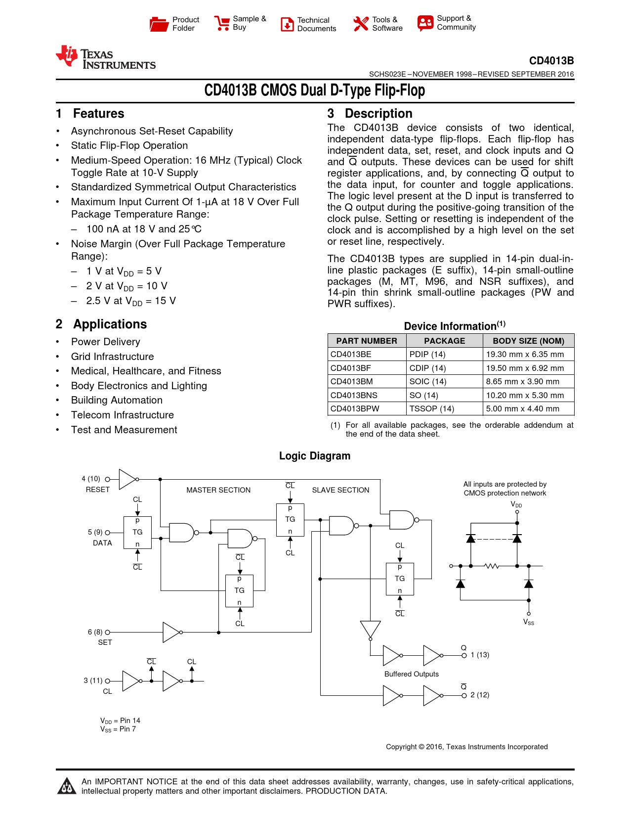 CD4013B. CD4013B CMOS Dual D-Type Flip-Flop. 1 Features. 3 Description. 2 Applications. Device Information(1). PART NUMBER. PACKAGE