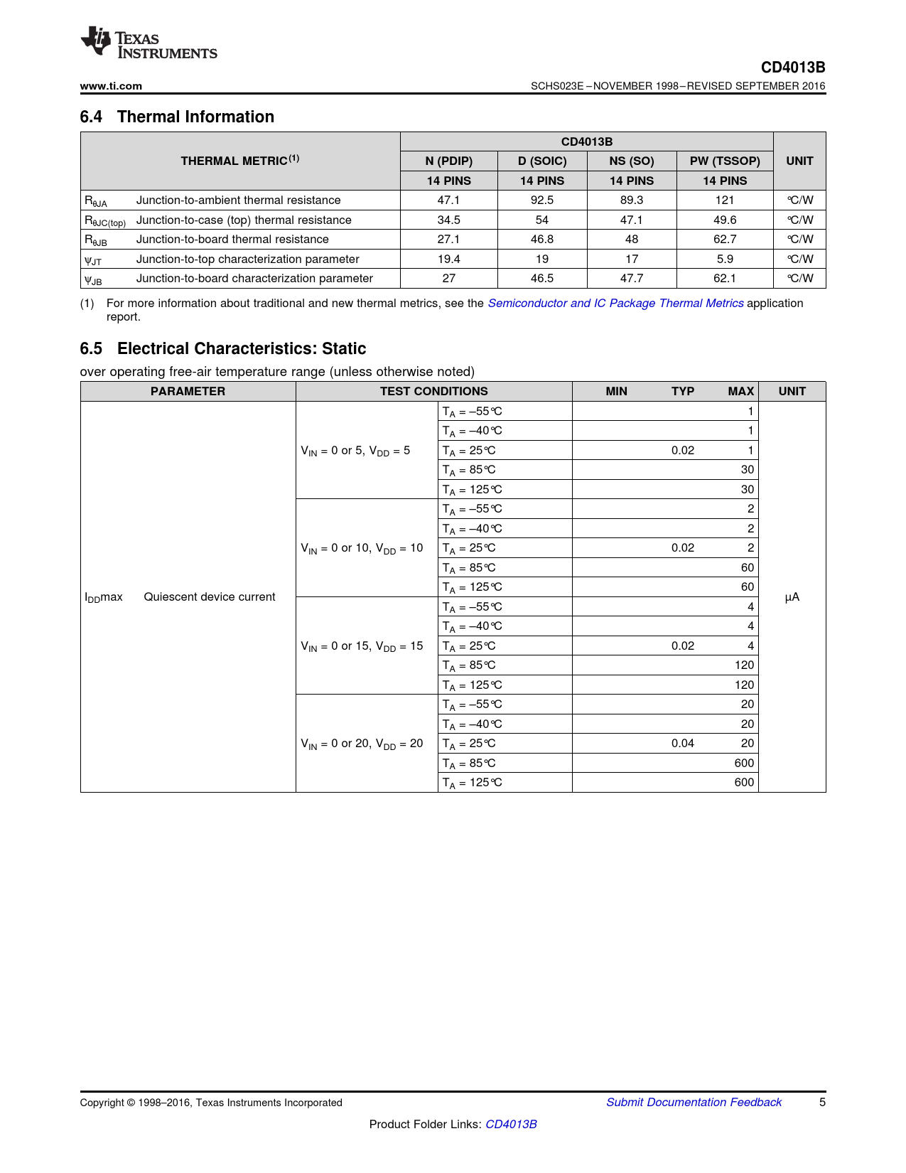 6.4 Thermal Information CD4013B THERMAL METRIC(1) N (PDIP) D (SOIC) NS (SO) PW (TSSOP) UNIT 14 PINS 14 PINS 14 PINS 14 PINS