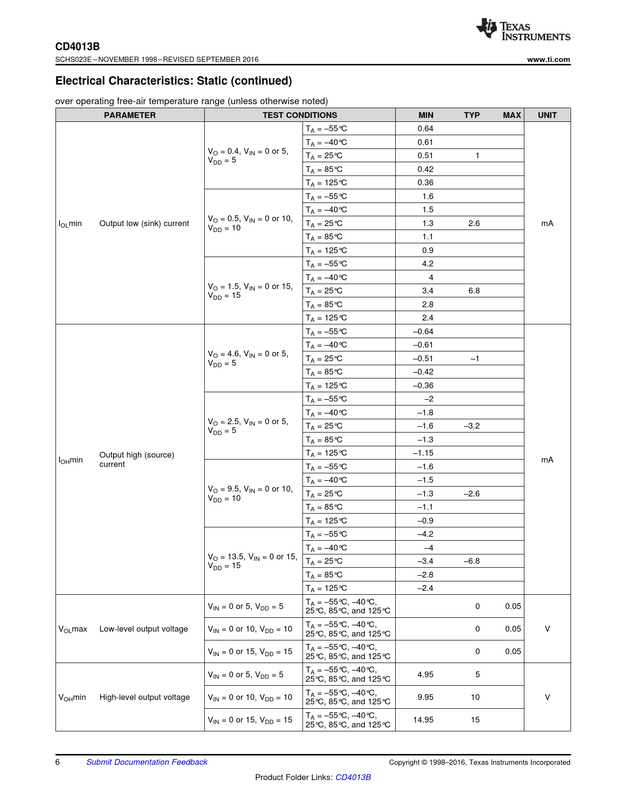 | Seiten / Seite | 28 / 6 — CD4013B. www.ti.com. Electrical Characteristics: Static (continued). … |