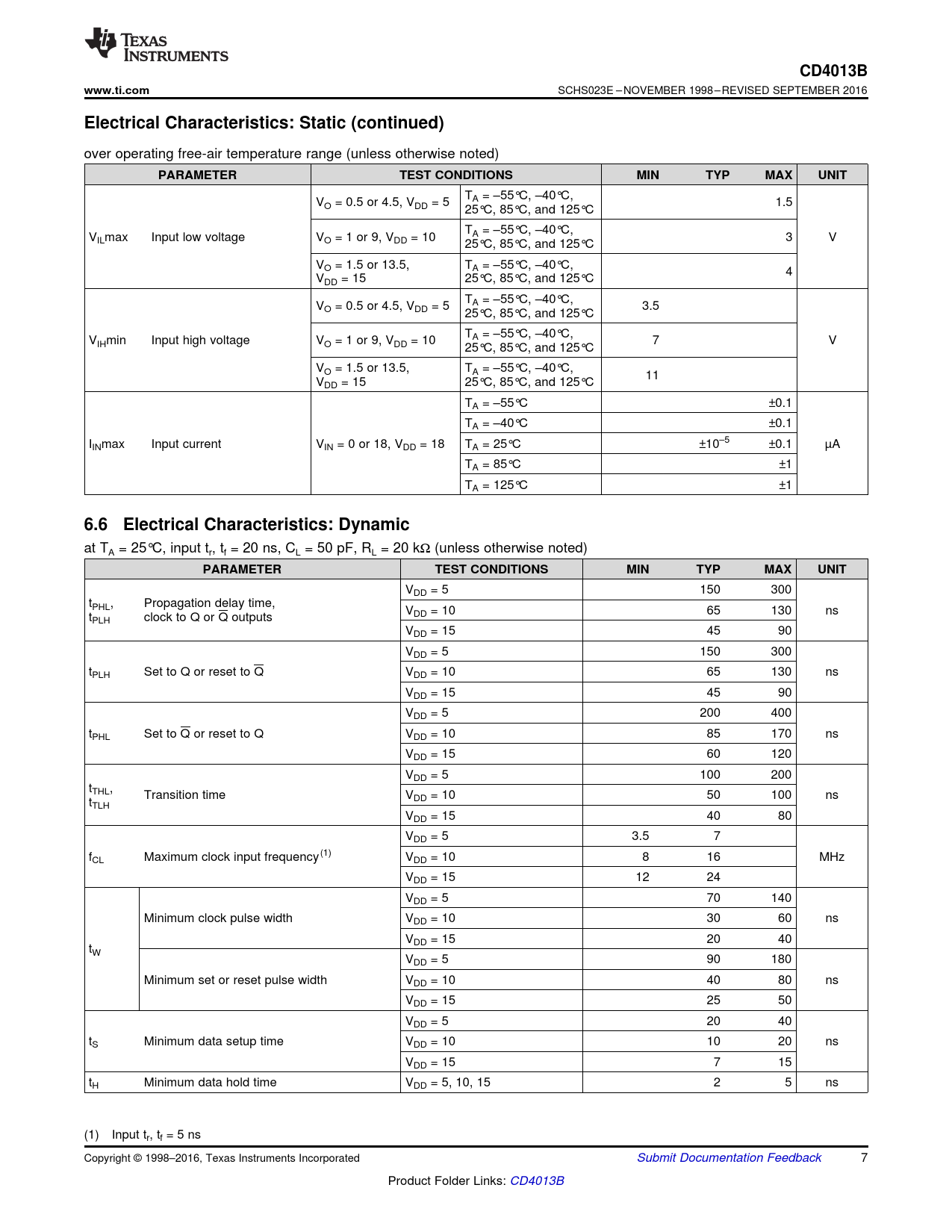 CD4013B. www.ti.com. Electrical Characteristics: Static (continued). PARAMETER. TEST CONDITIONS. MIN. TYP. MAX. UNIT