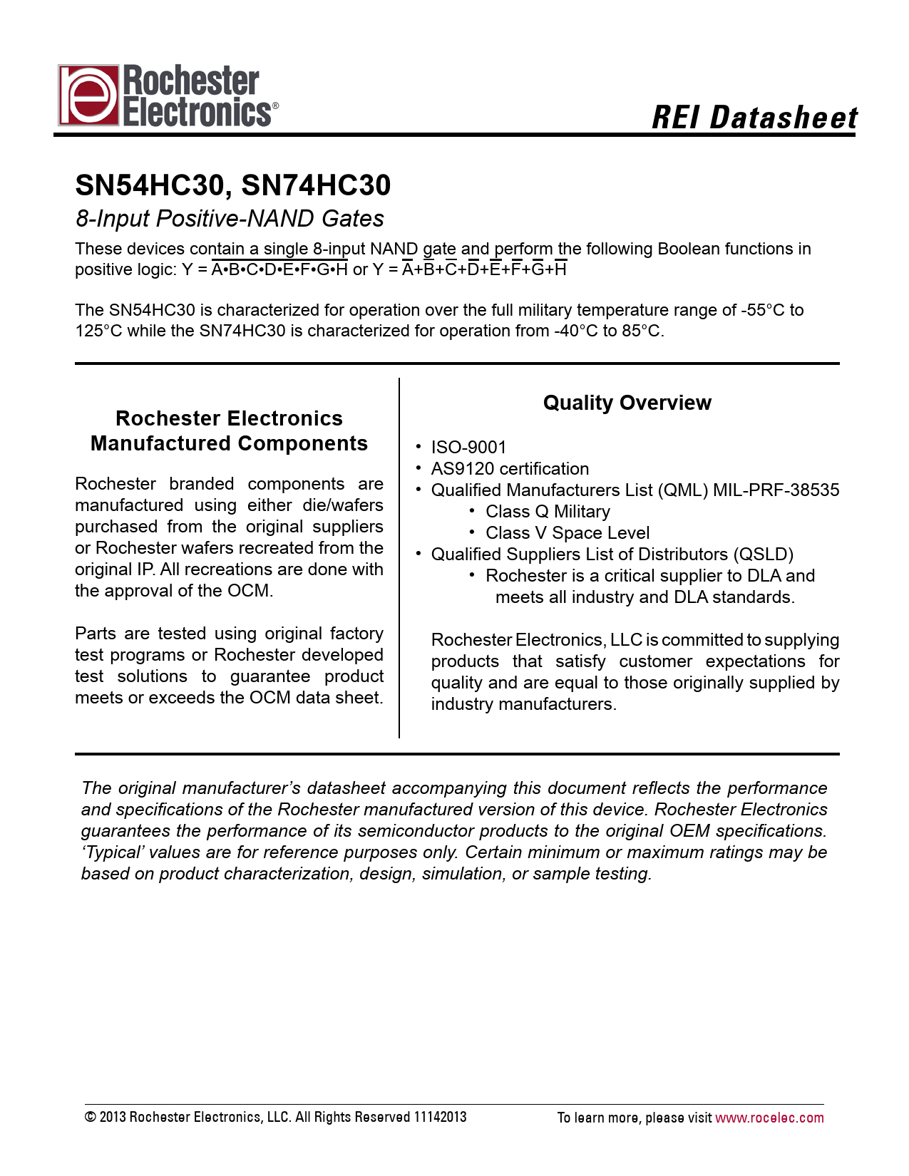 REI Datasheet. SN54HC30, SN74HC30. Quality Overview. Rochester Electronics. Manufactured Components