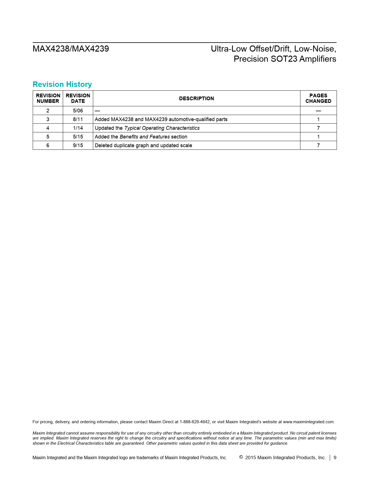 2 5/06 — — 3 8/11 Added MAX4238 and MAX4239 automotive-qualified parts 1 4 1/14 Updated the Typical Operating Characteristics 7 5 5/15 Added the Benefits and Features section 1 6 9/15 Deleted duplicate graph and updated scale 7 For pricing, delivery, and ordering information, please contact Maxim Direct at 1-888-629-4642, or visit Maxim Integrated’s website at www.maximintegrated.com. Maxim Integrated cannot assume responsibility for use of any circuitry other than circuitry entirely embodied in a Maxim Integrated product. No circuit patent licenses are implied. Maxim Integrated reserves the right to change the circuitry and specifications without notice at any time. The parametric values (min and max limits) shown in the Electrical Characteristics table are guaranteed. Other parametric values quoted in this data sheet are provided for guidance. Maxim Integrated and the Maxim Integrated logo are trademarks of Maxim Integrated Products, Inc. © 2015 Maxim Integrated Products, Inc. │ 9